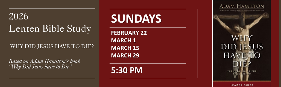 Join us for an inspiring journey through "The Message of Jesus" by Rev. Adam Hamilton. Our six-week Lenten Bible study kicks off on Sunday evenings at 5:30 p.m., starting on March 9 and continuing on March 16, 23, 30.